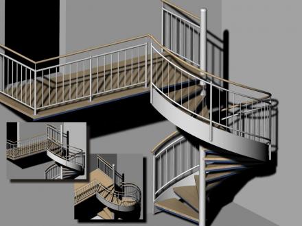 Handlauf auf Profilgeländern, Darstellung 2D/3D. - Eckverbindungen: Kugelgelenk, Schmiege und Bogenstück (Hörnchen). - Ausgabe der Schnitt- und Verdrehungswinkel zur manuellen Bearbeitung. - CNC-Bearbeitung der Holzhandläufe(Dornbohrung, Dübel, Schmiegen).