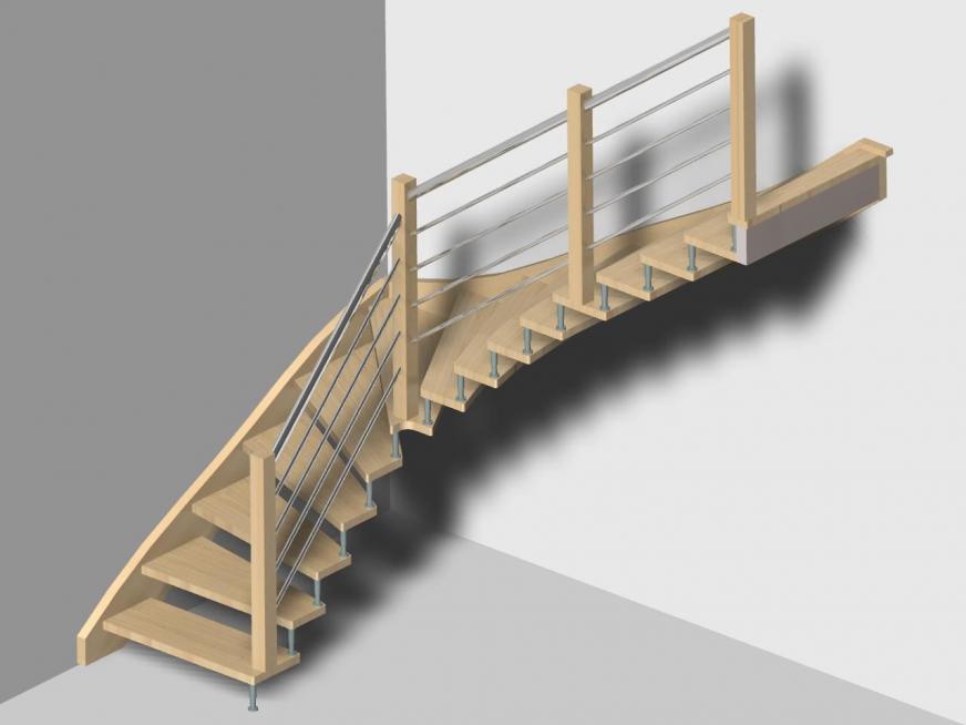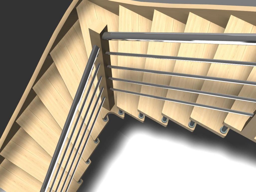 Die Bolzentreppe wie eine normale Treppe zu handhaben. Der Grundriß der Bolzentreppe kann eine gängige Treppenform oder eine Sonderform sein, der mit der "Freien Treppe" erstellt wurde. Es besteht die Möglichkeit, die Innen- und Außenwange mit Bolzen oder mit einer Wange zu konstruieren. Seitliche Bohrungen und Spannstäbe können kundenspezifisch eingestellt werden. Handlauf und Geländer sowie Brüstungsgeländer können wie bei allen anderen AICADstair Treppen ergänzt werden.