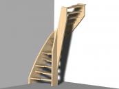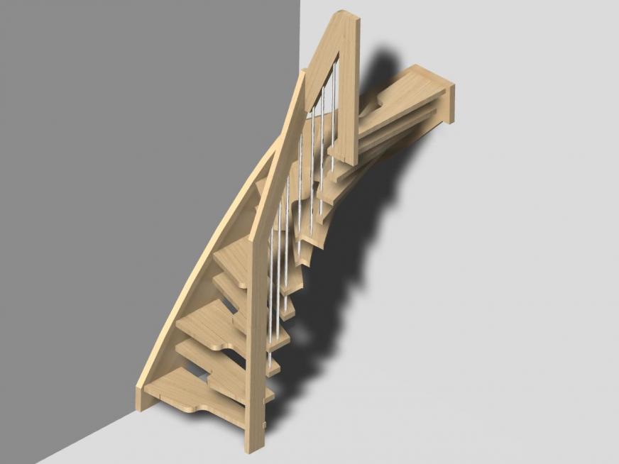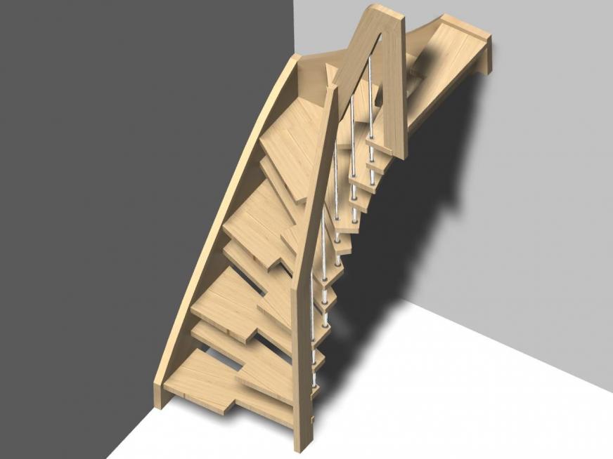 Bei sehr kleinen Treppenlöcher findet diese Treppe ihren Einsatz. Die Abarbeitung erfolgt in der gleichen Form wie bei den Standardtreppen. Nach Festlegung der Treppe im Grundriß können die Stufen bei Bedarf frei verzogen werden. Die Wangenteile werden im Grundriß und in der seitlichen Wangenabwicklung dargestellt und können bei Bedarf noch nachträglich verändert werden. Alle relevanten Treppendaten wie Stufen, Wangen und Pfosten können als Schablonen 1:1 oder direkt an eine CNC-Maschine zur Fertigung übergeben werden.