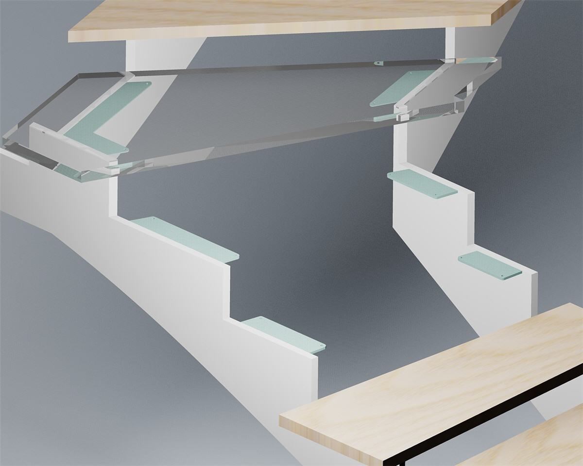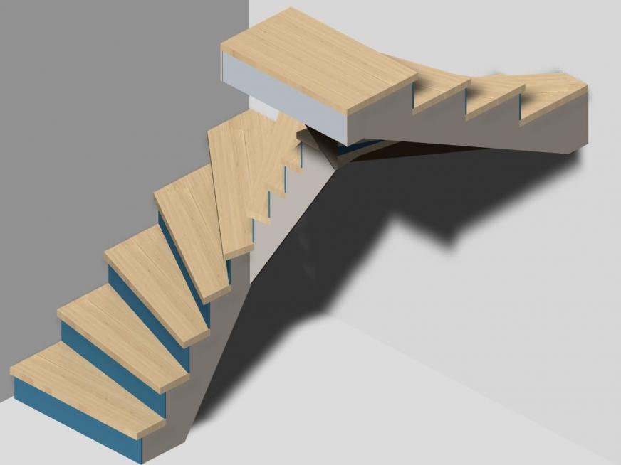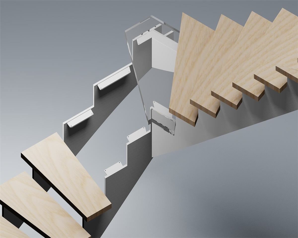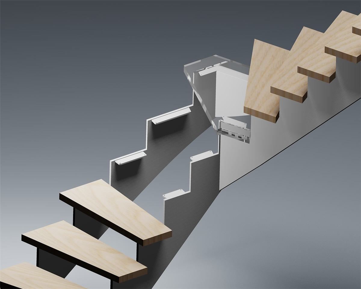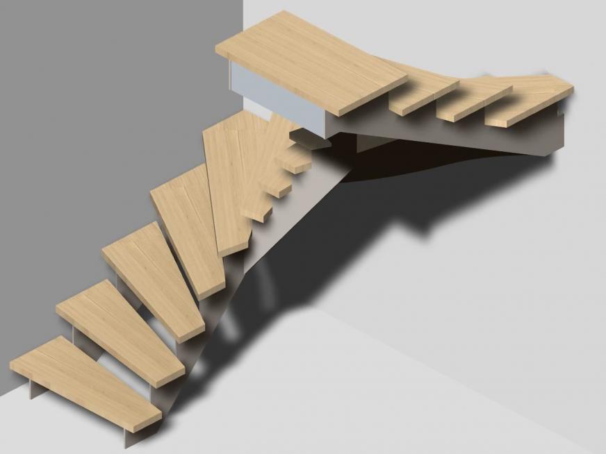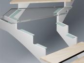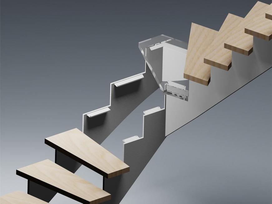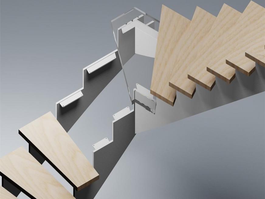 Die "Aufgesattelte Treppe" ist im Stahlbereich eine Alternative zur Holmtreppe. Der Grundriss der "Aufgesattelten Treppe" kann eine gängige Treppenform oder eine Sonderform sein, der mit der "Freien Treppe" erstellt wurde. Die Wangen können sowohl gerade als auch bogenförmig (z.B. Krümmling) abgewickelt werden und Wangenverbindungen können unterschiedlich ausgebildet werden. Wangen-Stufenverbindungen (Bohrungen / Ausfräsungen) können wahlweise in Stufen und/oder Wangen dargestellt werden.