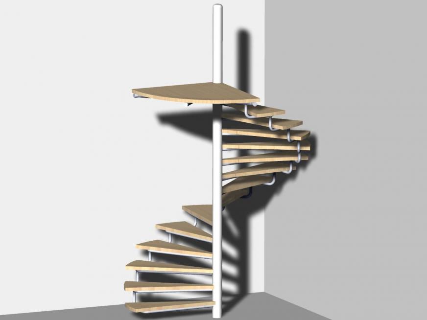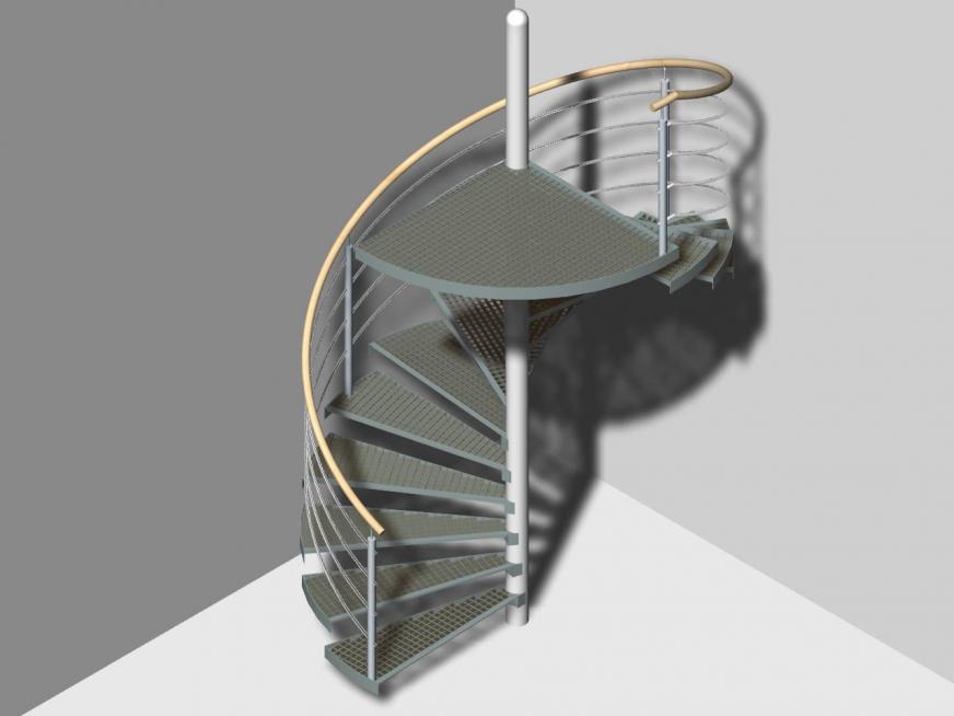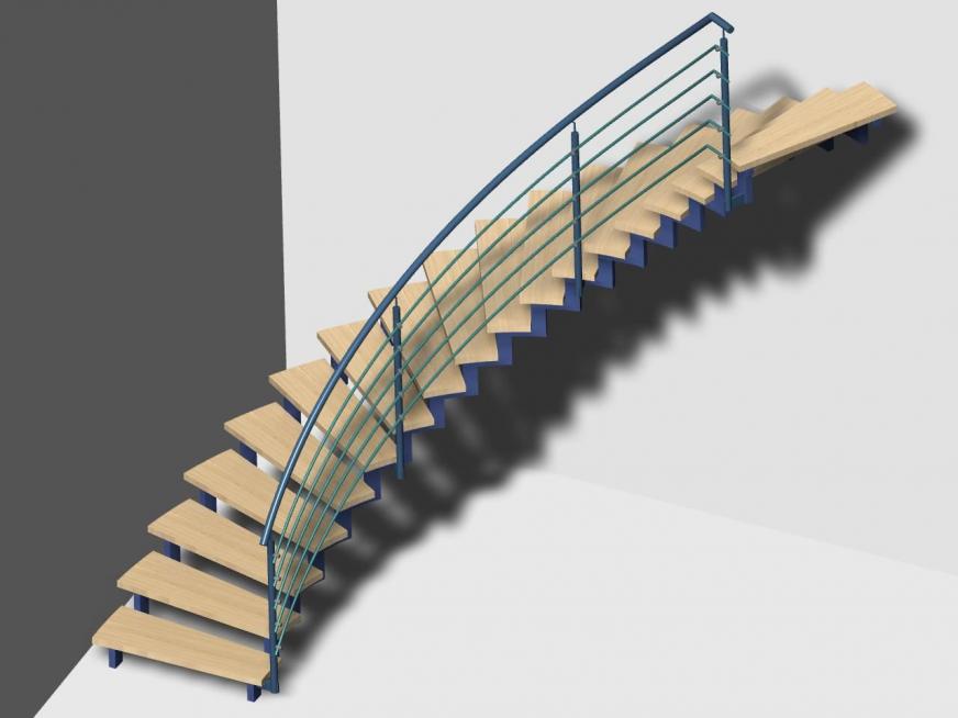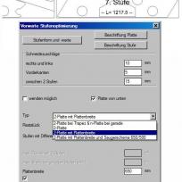 Die Spindeltreppe ist wie eine normale Standardtreppe zu handhaben. Der Grundriß der Spindeltreppe kann kreisförmig, rechteckig oder ein Polygon sein. Es besteht die Möglichkeit, die Treppe als Bolzen-, Satteltreppe oder mit Wange zu konstruieren. Die Einteilungen der Stababstände, Materialstärken, Untertritt und Exzentriziät können als Vorwerte eingestellt werden. In der seitlichen Abwicklung werden die Stabachsen und Unterkonstruktionen dargestellt. Mit der Standard-Stufenabwicklung können die Stufen eingestemmt, abgerundet, verkürzt oder verlängert werden. Die Stufen können mit Steineinlegearbeit,Teppicheinfräsung oder mit Ausfräsung der Unterkonstruktion abgewickelt werden.