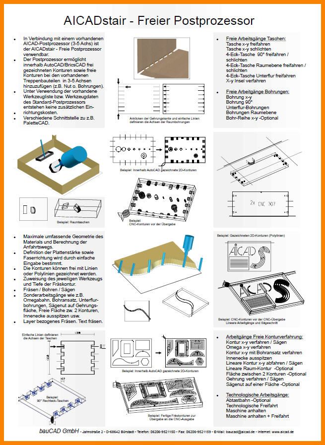 ist in Verbindung mit einem vorhandenen AICAD-Postprozessor (3-4-5 Achs) der "Freie Postprozessor" erhältlich. Dieser Postprozessor ermöglicht innerhalb AutoCAD , Bohrungen, Taschen, Gehrungen und auch frei gezeichneten 2D-Konturen (teils auch 3D) vorgegebene Arbeitsgänge zuzuweisen und abzuarbeiten. Es wird auf die vorhandene Werkzeugliste bzw. Werkzeugdaten des Standard-Postprozessors zugegriffen und alle relevanten Einstellungen daraus entnommen. Es entstehen dadurch keine Einschränkungen und es fallen auch keine weiteren Einrichtungskosten an. Mit dem Kauf des Freien Postprozessors besteht außerdem die Möglichkeit, Bohrungen, Taschen und freie Konturen bei den vorhandenen AICAD-Trepppenbauteilen in 3-4-5 Achsen hinzuzufügen.