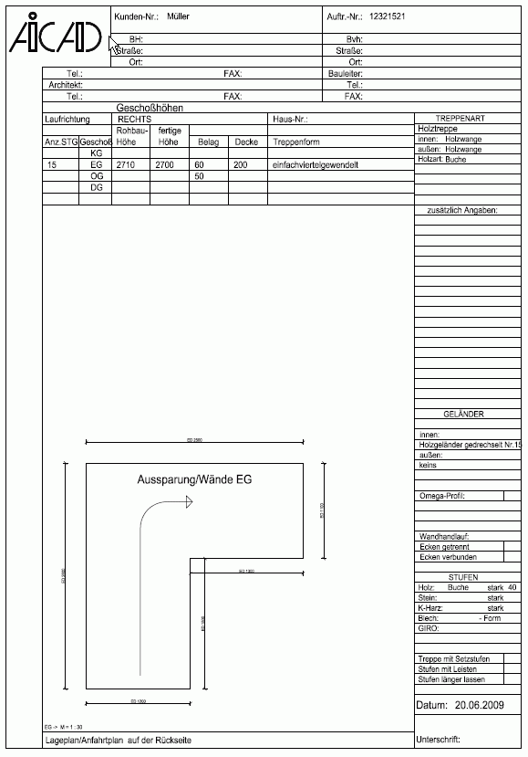 Eingabe aller relevanten Auftragsdaten, wie z.B. Grundriss-und Geschossdaten, Treppentyp, Ausführung und eventuelle Sonderfälle. Syntaxkontrollen bei der Eingabe und gleichzeitige zeichnerische Darstellung der Geometrie. Mehrere vorgegebene Lochformen und Treppenvarianten je Geschoss. Eingabe von unterschiedlichen Treppenumrissen (Standardformen oder Freie Form). Zusätzliches Hinzufügen von freien Bezeichnungen und Texten. Darstellung der Aussparungen und der Wände auf dem Aufmaßblatt oder als 1:1 Geometrie innerhalb des Programms. Beim Einsatz in Verbindung mit AICADstair ist die Datenübernahme gewährleistet. Mit dieser Option können die aus dem Aufmaß kommenden Daten direkt in die Konstruktion übernommen werden und müssen nicht mehr eingegeben werden.